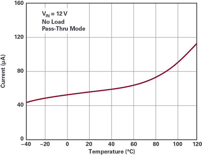 對(duì)于DC-DC轉(zhuǎn)換器設(shè)計(jì)者來(lái)說(shuō),汽車電池和類似的寬電壓范圍電源是一個(gè)復(fù)雜的問(wèn)題,需要保護(hù)功能以及高效率的降壓和升壓轉(zhuǎn)換。具有直通功能的同步降壓-升壓控制器將保護(hù)功能與寬輸入范圍的降壓-升壓轉(zhuǎn)換器結(jié)合在一起,從而消除了復(fù)雜性。直通模式消除了開(kāi)關(guān)損耗和噪聲,同時(shí)實(shí)現(xiàn)了超低靜態(tài)電流(圖6。在直通模式下,輸出電壓不是常規(guī)意義上的調(diào)節(jié),而是由可編程電壓窗口限制。