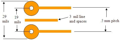 使用新的微電路設計技術(shù)代替常規(guī)的印刷電路技術(shù)可節(jié)省大量的空間。如今,典型的75微米線寬的最佳間距約為.5mm,通過75微米線和250微米(10mils)的焊盤可得到75微米(3mils)。墊片之間的間距為225微米(9mils),墊片之間僅允許一條75微米的線,對于大多數(shù)商店來說,這種最小規(guī)格是很難的。