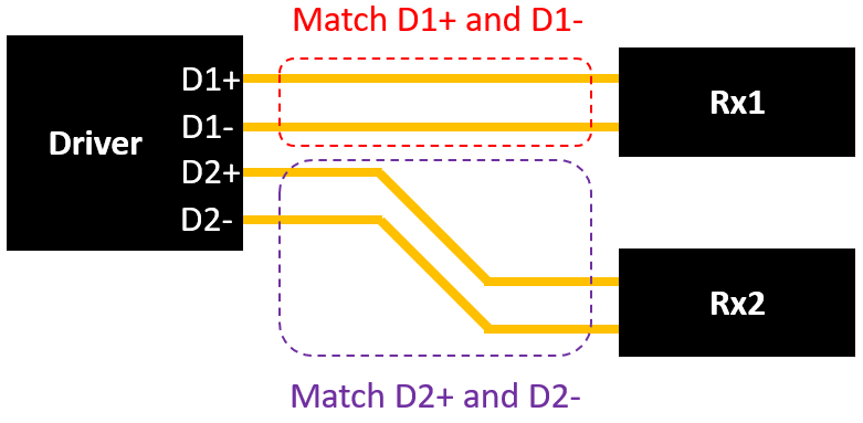 上面顯示的差分對在單個驅動器(例如,FPGA)和兩個不同的接收器之間路由。每個接收器分別讀取D1D2上的差分信號。在此,差分對D1的每一端都需要進行長度匹配。類似地,差分對D2的每一端都需要長度匹配。但是, D1D2不需要彼此匹配,因為它們沒有并行傳輸數(shù)據(jù)。這些差分對中的每對一次只傳送一個比特,我們只需要進行長度匹配以確保在每對中消除共模噪聲。