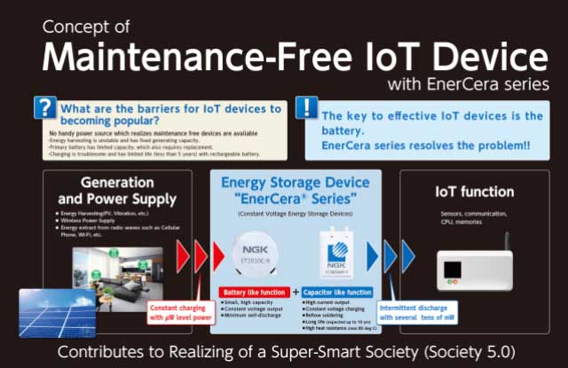 在去年的CES 2019上,NGK Insulators Ltd.(NGK)的硬幣和郵袋類型“ EnerCera”系列榮獲CES創(chuàng)新獎(jiǎng)(在智能能源類別中)。隨著二次電池產(chǎn)品系列的推出,解決物聯(lián)網(wǎng)設(shè)備電池問題的期望越來越大。晶體取向陶瓷板僅由活性材料組成,在小而薄的主體內(nèi)實(shí)現(xiàn)了高能量密度和低內(nèi)阻。它還具有高溫安裝的獨(dú)特特性。EnerCera系列可以運(yùn)行需要大電流(例如,幾10 mA至幾100 mA)的IC,傳感器和無線通信系統(tǒng)。此外,CV(恒定電壓)充電功能消除了使用充電器IC控制充電電流的需要。EnerCera系列的定位是在不久的將來提供一次電池的替代產(chǎn)品。