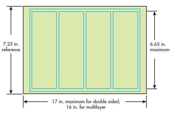 對于厚度大于或等于0.06英寸(1.5毫米)的FR4HTFR4 PCB,并排最多可容納1.5英寸的五個板。板寬,四塊板最大為2.5英寸。板寬,三塊板,最大4英寸。板寬,兩個用于7.5英寸以下的板。板寬。最長6.65英寸的板可在面板上旋轉90°,并沿著陣列的長軸并排放置,以適合標準的7.25英寸。寬度。僅當結果面板的長度大于寬度時,這才有意義,因此您可以將板子添加到陣列中以有效利用制造商的面板(圖13)。