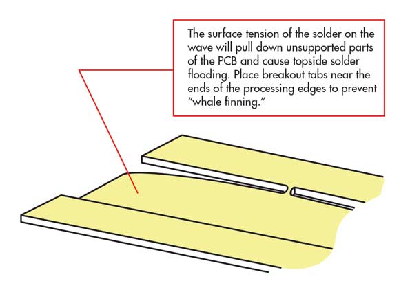 8.波峰上焊料的表面張力會拉低PCB上不受支撐的部分,并導致頂部焊料溢流。在處理邊緣的末端附近放置分接凸耳,以防止鯨魚劃傷。
