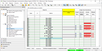 在上圖中,這四個(gè)網(wǎng)絡(luò)標(biāo)記為紅色,因?yàn)樨灤┻@些網(wǎng)絡(luò)的最小值和/或阻抗值均超出34±5%范圍(32.335.7歐姆)。約束管理器顯示阻抗范圍為32.069歐姆至46.62歐姆;這些值可以出現(xiàn)在這些網(wǎng)上的任何地方。這可能是由于與其他導(dǎo)體的意外寄生耦合,走線寬度的變化或在參考平面上的間隙上布線引起的。