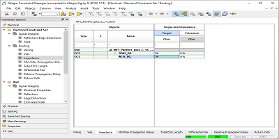 我們要檢查的四個(gè)跡線不是這些網(wǎng)絡(luò)組的一部分,但是如果需要,我們可以將這些跡線分配給這些網(wǎng)絡(luò)組。另一個(gè)選擇是在電氣約束集中單獨(dú)定義這些走線的阻抗約束。要應(yīng)用該規(guī)則,只需在約束管理器中向下滾動到電氣工作表中的網(wǎng)絡(luò)部分。當(dāng)打開路由”→“阻抗部分時(shí),您將能夠看到所有網(wǎng)絡(luò)以及它們所屬的組。
