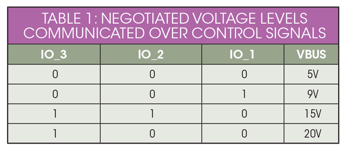 在這種方法中,芯片檢測(cè)并與設(shè)備協(xié)商功率,并通過(guò)控制信號(hào)傳達(dá)協(xié)商的功率水平。協(xié)商的電源可以為5、9、1520 V (表1。該芯片還實(shí)現(xiàn)了進(jìn)出電池組的電源路徑。
